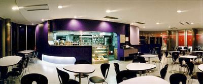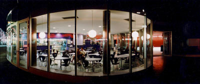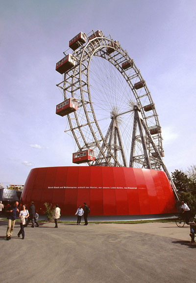 Wenn man sich vom Praterstern her nähert, bildet er den Sockel, über dem das Riesenrad emporragt. Zu den Vergnügungsstätten hin orientiert liegt das rundum verglaste Café, das seinen Gästen den Panoramablick auf das bunte Treiben des Wurstlpraters gewährt. Zwischen dem roten und dem gläsernen Bauteil liegt die Kassa als anthrazitgrau verblechter Pavillon, aneinander-gebunden sind die drei Einzelelemente durch die zurückversetzten Eingänge ins Foyer.