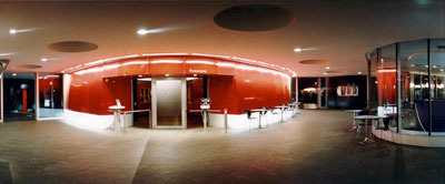 Der größte Baukörper, das Panorama, ist wie ein Schiffsrumpf nach außen hin völlig geschlossen und an seiner doppelt gekrümmten Außenwand mit rotem Alublech verkleidet.
