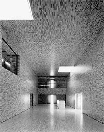 Aber vor allem haben sie für das Innenleben dieses Hauses der Münchener Rück etwas gebracht. Denn durch den Büroflächengewinn der vierten Achse konnten die Architekten das Gebäude innen aufschneiden. Der Effekt ist ziemlich eindrucksvoll: Man betritt das Haus über den gläsernen Windfang und findet sich in einer 55 Meter langen, sieben Meter breiten und sechs Meter hohen Halle wieder, die rundum mit massivem kanadischem Ahorn im Stäbchenformat verkleidet ist. Die Überraschung gelingt perfekt: Urplötzlich steht man in einem - durch drei asymmetrisch ins Hallendach eingeschnittene Oberlichten - auch natürlich belichteten Raum, der aber atmosphärisch ganz deutlich eine eher introvertierte Charakteristik hat. Diese Halle ist übrigens nicht nur Verteiler. Sie funktioniert auch als Aufenthaltsraum für die Mitarbeiter (es gibt ein Automatenbüffet) und durch temporär mögliche Bühnenaufbauten als kleinerer Veranstaltungsort (für 80 bis 100 Personen).