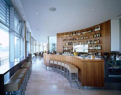 Die Durchblicke drinnen und nach außen wurden wieder eröffnet, die zugemauerten Fenster frei gemacht. Während der einstige Anbau von Niedermoser an der Stromseite der Urania wie eine Hinterhofbude wirkte und auch unbewusst die traditionelle und leicht belegbare Abneigung der Wiener gegenüber den Gewässern der Stadt und den Stadtteilen hinter dem Donaukanal ausdrückte, nützt Manikas mit der Cafeteria die Lage am Strom rest- und tadellos aus. Zelebriert die Lage, grüßt mit der neuen Architektur das vorbeifließende Wasser, den weiten Ausblick nach links und rechts und zum anderen Ufer des Donaukanals hin, zur Leopoldstadt.
