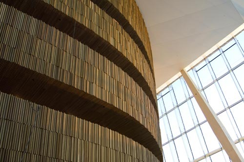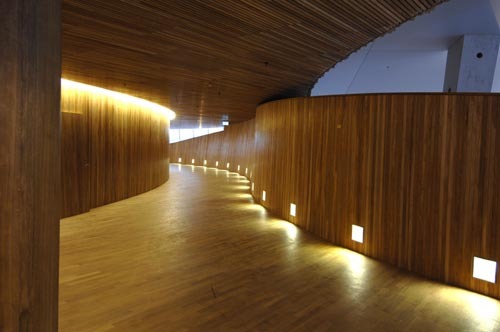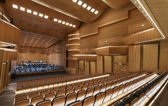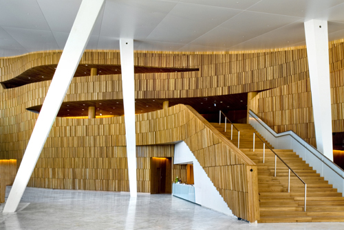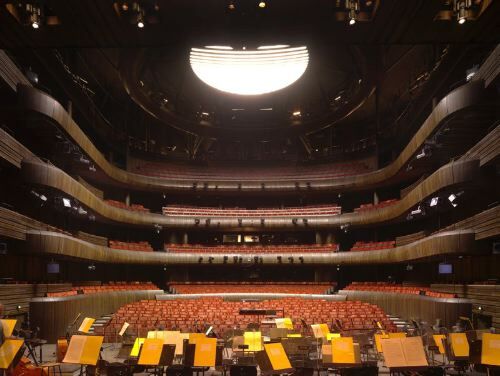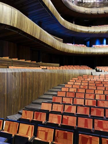 Dass das Gebäude nicht nur als städtischer Aussichtsbalkon, sondern auch als Oper taugt, versteht sich von selbst. Im Inneren des harten Glaskristalls liegt das eigentliche Herz des Hauses: das Auditorium. Wie eine dunkle Nussschale schließt es sich nach außen ab und zeigt dem Foyer seine Rückseite. Der wahre Kunstgenuss bleibt verborgen, umgeben von geräucherter Eiche und rotem Samt. „Als der Hörsaal akustisch getestet wurde, saßen alle wie versteinert da und redeten kaum ein Wort“, erinnert sich ein Haustechniker, „als dann das Ergebnis bekannt gegeben wurde, konnten die Architekten nicht aufhören zu grinsen.“
