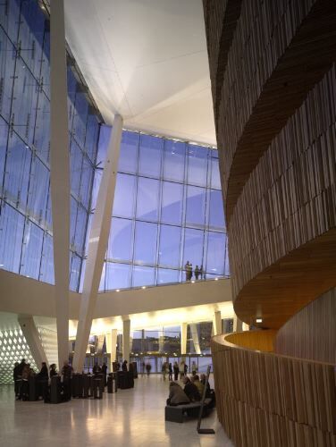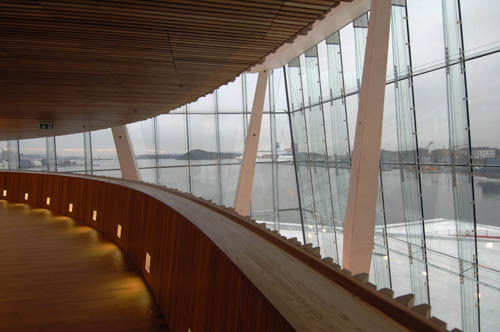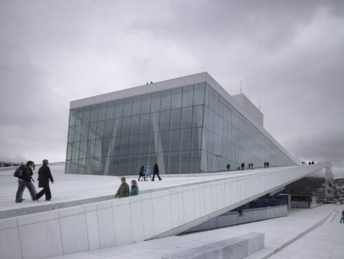 Dass man es nicht nur auf die Hochkultur und auf gut betuchte Klientel abgesehen hat, zeigt sich bereits an der Landschaftsgestaltung. Wie ein kalbender Gletscher rutscht das Dach der Oper in den Bjørvika-Fjord hinab. Die weißen Eisschollen in Schieflage bieten allerhand Möglichkeiten. Ewings: „Im Sommer hat das Wasser im Fjord manchmal 20 Grad. Hier werden Leute baden und in der Sonne liegen, werden fischen, mountainbiken, Skateboard fahren und werden am Abend am Boden sitzen und schmusen. Und ach ja: In die Oper werden sie auch gehen.“