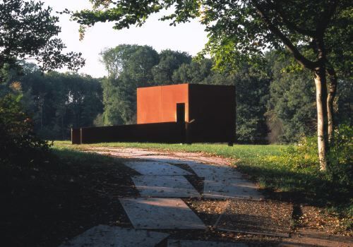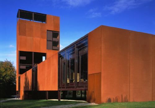 Wie ein Wegweiser taucht aus dem Grün des ehemaligen Schlachtfeldes die rostrote Farbe auf - als Wegmarke oder als Gebäudehülle - und führt den Besucher durch die Geschichte des Landstrichs. In Kalkriese wurde 2002 auf dem mutmasslichen Schauplatz der „Schlacht im Teutoburger Wald“ ein archäologisches Museum errichtet, entworfen und gebaut vom Schweizer Architekturbüro Annette Gigon und Mike Guyer. Der wetterfeste Baustahl verbindet alle sichtbaren Elemente zu einer Einheit: Er verkleidet nicht nur drei Pavillons und das flache Ausstellungsgebäude mit Treppenturm, sondern findet sich auch bei Wegplatten, Stützwänden und Palisadenstangen wieder. Mit seiner bräunlich changierenden Oberfläche fügt er sich harmonisch in das parkartige Gelände ein.
