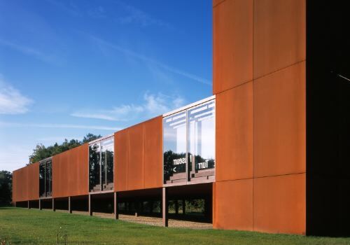 Das Museumsgebäude ist wie die Pavillons als Stahl-Skelettkonstruktion errichtet und mit grossflächigen rostenden Stahlplatten beplankt. Auch im beheizten Innenraum des Museums sind Stahlplatten für die Verkleidung verwendet worden: Gewalzte Stahlbleche für Wand und Deckenverkleidungen und nicht rostender Stahl für die Bleche des Bodenbelags. Die Stahlskelettkonstruktion des Hauptgebäudes und die Fensterrahmen bestehen aus normalem Baustahl, der mit einer dunklen rotbraunen Farbe beschichtet ist. Grossformatige Platten aus wetterfestem Stahl bilden die Aussenhaut der Wände und Dächer; die liegenden Platten sind durch Winkel versteift. Die konstruktiven Details wurden werkstoffgerecht ausgebildet.