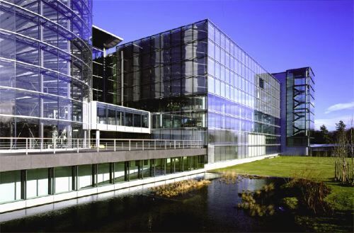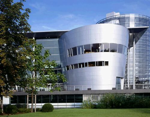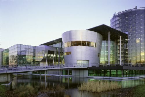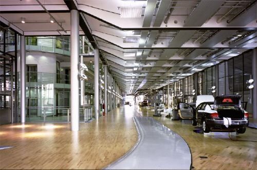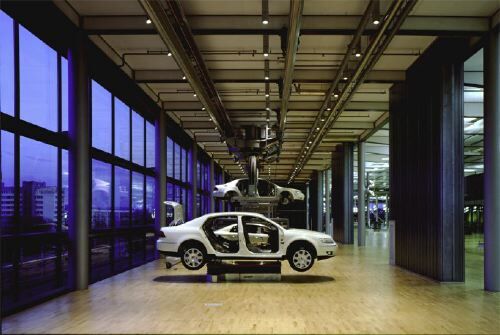 Gewissermassen handelt es sich bei dem ringsum verglasten Komplex um die Simulation einer Fabrik im postindustriellen Zeitalter: Auf drei Ebenen soll hier vor den Augen betuchter Kunden und neugieriger Besucher die Herstellung der neuen Luxuslimousine erfolgen, mit der VW in den Topmarkt des Automobilgewerbes einsteigen möchte. Getauft ist die Edelkarosse auf den Namen «Phaeton». Dass es sich bei Phaethon - folgt man dem Mythos - um den Sohn des Helios handelt, der, des Lenkens unfähig, mit dem durchgehenden Sonnenwagen seines Vaters die Erde in Brand steckte, ist den VW-Managern offensichtlich entgangen. - Vorbei scheinen die Zeiten, in denen ölverschmierte Arbeiter an Karosserien herumschraubten. Die Fliessbänder sind hier in Parkettboden eingelassen, Lärm und Gestank gehören der Vergangenheit an. Solchermassen geläutert, darf die Fabrik wieder ins Stadtzentrum zurückkehren, umweltfreundlich beliefert von einem Cargo-Tram. Dass grössere Montageteile nicht in eine Strassenbahn passen und per LKW transportiert werden müssen, wird ebenso verschwiegen wie die Tatsache, dass sich die eigentlichen Herstellungsstätten mit Presswerk und Lackiererei weiterhin am Stadtrand befinden. Letztlich handelt es sich bei der «Gläsernen Manufaktur» um ein Endmontagewerk, bei dem vor den Augen des Publikums Karosserie und Fahrwerk zueinander finden. Kein Wunder also, dass hier nur drei Roboter arbeiten und der Rest der Arbeit von Hand verrichtet wird.