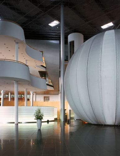 Wirken die jeweils 150 Meter langen Glasfassaden zur Stübelallee im Norden und zum Anlieferungshof im Osten alles andere als einladend, so zündete das Münchner Büro Henn Architekten an der zur Lennéstrasse und zum historischen Grossen Garten hin orientierten Südwestecke ein formales Feuerwerk. Hier befinden sich der Besuchereingang und das Foyer, das auch Restaurant, VIP-Lounge, Museum, Konferenzräume und Kinosäle umfasst. Vertikale Dominante bildet ein gläserner Autoturm, wie man ihn von der «Autostadt» Wolfsburg kennt (NZZ 28. 7. 00), dazu treten ein in den Boden gerammter Kegel, ein aufgestelztes blasenartiges Gebilde und eine Kugel aus Drahtgeflecht; verbunden wird alles durch ein weit ausgreifendes Dach. Zweifellos besitzt dieses Ensemble einen gewissen Unterhaltungswert, doch wirkt alles wie aus zweiter Hand. Fragmente aus dem Arsenal der Moderne bilden ein munteres Pasticcio - hier ein wenig Nouvel, dort etwas Ito, gewürzt mit einer Prise Archigram und einem Hauch des in den zwanziger Jahren auf dem Terrain errichteten Kugelhauses.
