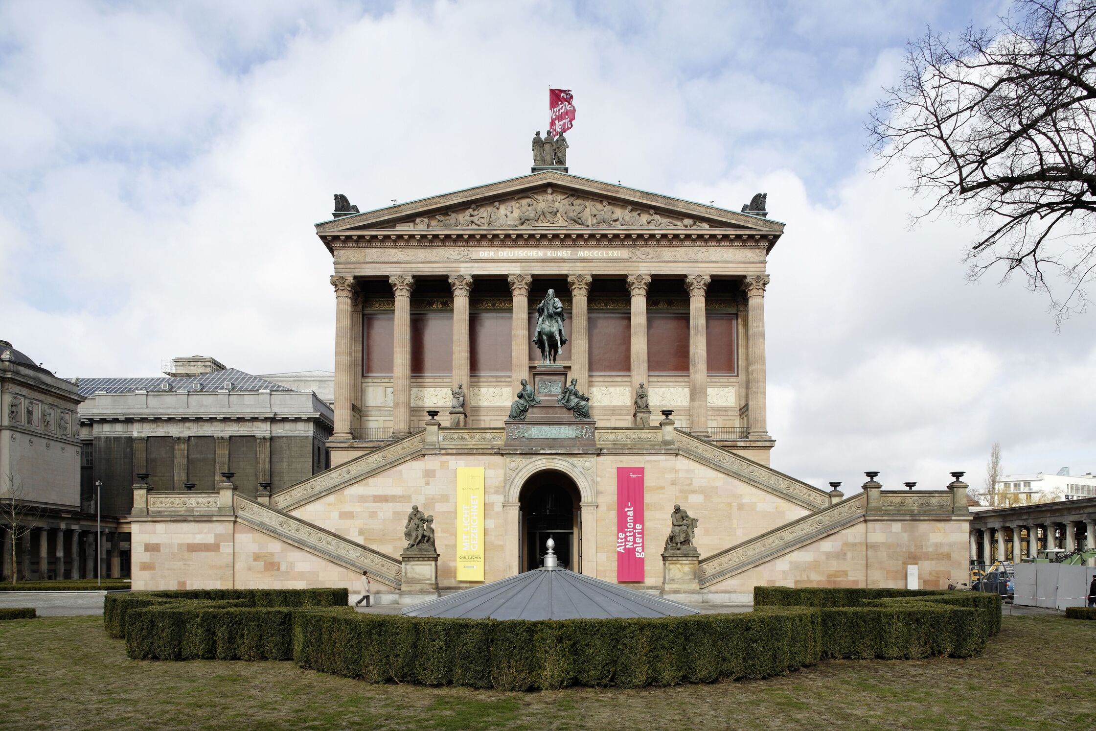Die prächtige vorgelagerte Freitreppe ist ohne Funktion, sie dient einzig der Ästhetik und als Sockel für das Reiterstandbild König Friedrich Wilhelms IV.: Dieses Gebäude sollte die Liebe zur deutschen Kunst beheimaten und dem Willen zum Einheitsstaat Gestalt verleihen. Entstanden ist es im 19. Jahrhundert dank einer Bürgerinitiative, weshalb dem König der Name der «National-Galerie» lange nicht behagte. Im 20. Jahrhundert schrieb ihr Mies van der Rohes Neue Nationalgalerie die Rolle der grossen Schwester zu. Von Anfang an war die Alte Nationalgalerie zu mehr geboren, als «nur» Museum zu sein. So blickt sie erhaben auf ihre berühmten Nachbarn, auf Schinkels Altes Museum und Stülers Neues Museum. Sie ist die kapriziöse Prinzessin unter den Königshäusern auf der Museumsinsel. Nun strahlt ihre gereinigte Sandsteinhaut wieder und ist leicht gerötet. Am Sonntag wird die Alte Nationalgalerie nach umfassender Sanierung wieder eröffnet - erstmals seit dem Zweiten Weltkrieg sind dann ihre Bestände wieder vereint.