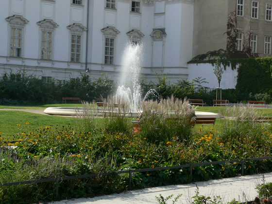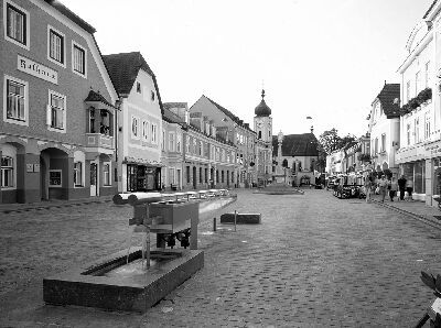 Der vorläufig letzte Akt in der Gestaltung der Plätze ist die heftige Debatte um die beiden Brunnen, die Ernst Beneder für den Oberen und den Unteren Stadtplatz entworfen hat. Die Leistung eines guten Brunnens besteht seit der Barockzeit in nichts anderem, als Wasser in Bewegung zu bringen: Je aufwendiger die Wasserführung, je charakteristischer der Klang, desto besser. Auf dem Unteren Stadtplatz läßt Beneder das Wasser kontemplativ auf eine kreisrunde Glasscheibe fließen und durch Bohrungen in ein quadratisches Becken plätschern. Auf dem Oberen Stadtplatz ist der Brunnen ein schmaler Waschtisch aus Glas und Stahl, ein räumlicher Auftakt für die Zeile von Ständen, die an Markttagen auf dem langgestreckten Platz aufgebaut wird.