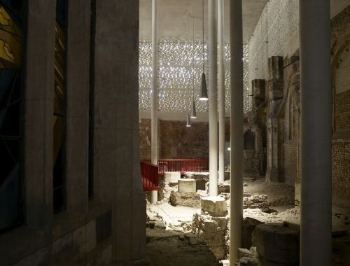 Zumthors Lösung ist ungewöhnlich. Er stellt Alt und Neu nicht als Gegensatzpaar nebeneinander, sondern folgt dem trapezförmigen Umriss der früheren Kirche und baut fugenlos auf den Resten des Mauerwerks auf – ganz so, als sollten die offenen Wunden nun endlich geschlossen werden. Auf Straßenniveau ist das Museum größtenteils ein Überbau, der das archäologische Feld ebenso wie die Kapelle in eine mächtig-hohe Halle einschließt, die Innen- und Außenraum zugleich ist. Ein von einem unregelmäßigen, doch vorgegebenen Lochmuster durchzogenes Filtermauerwerk aus einem eigens entwickelten Backstein umhüllt den Raum, belüftet ihn und erzeugt, je nach Tageszeit und Lichtintensität, feierliches Dämmerlicht oder fröhlich-bewegte Lichtpunkte an den Wänden. Über die Halle wird, absatzlos, nur durch den Wechsel von gelochtem zu massivem Mauerwerk zu erahnen, der eigentliche Ausstellungsbereich geschichtet.