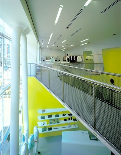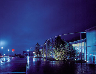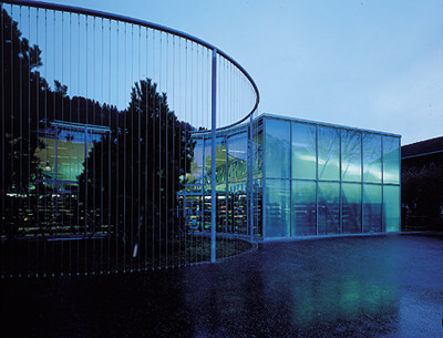 Perraults Antwort auf diese Situation ist getragen von grosser Gelassenheit, er reagiert mit einem Solitär und erreicht dennoch die Einbindung seines Baukörpers in diese periphere Lage. Eine orthogonale Struktur, die dem Bautypus entgegenkommt, bildet die ruhige Basis für eine architektonische Geste, die gezielt den Rahmen der kommerziellen Nutzung relativiert. In den Raster des Gebäudes ist nämlich ein gewelltes Gerüst aus vertikalen Stahlträgern und Drähten eingeschrieben, die gleichsam wie ein Zaun neun Kiefern umfassen. Eine solche Einfriedung fällt ins Auge, macht aufmerksam. Aber sie verweist auf mehr: Zum einen bringen die hochalpinen Gewächse die Natur wieder symbolisch ins Tal herunter, zum anderen instrumentieren sie die visuelle Aufhebung der Grenzen zwischen innen und aussen. Diesem Implantieren eines biologisch generierten Artefakts eignet allerdings auch ein Widerspruch, ein Widerspruch, der sich in der Beziehung zwischen der Natur und ihrer zivilisatorischen Aneignung wieder findet: unmittelbar an Ort und Stelle nachvollziehbar und vom Architekten in seinem Mikrokosmos ästhetisiert.