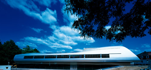 Im Jahr 1999 wurde ein Gutachterverfahren ausgeschrieben, aus dem das Projekt von Najjar & Najjar, eine röhrenförmige glänzende Struktur, die sich diagonal an die Grundstücksgrenze vorschiebt, als Sieger hervorging. Die Hülle aus Aluminium schwingt sich in einer Wellenbewegung zu einer beinahe monumentalen, schräg über zwei Geschoße angeschnittenen Öffnung zur Bundesstraße hin auf, hinter der ein Großraumbüro mit eingezogener Galerie liegt. Auf dem oberen Niveau - also innerhalb der Aluminiumhülle - sind weitere Büros angeordnet. Im fast durchgehend verglasten Erdgeschoß liegen Laborräume. Eine großzügige zentrale Halle mit Oberlicht verbindet die