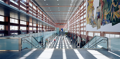 Herzstück des Gebäudes ist die 104 Meter lange, über 15 Meter hohe lichtdurchflutete Bahnhofshalle im Untergeschoss. Die mit Fenstern durchsetzte Fassade gestattet Einblick auf das Geschehen an den Bahnsteigen. In ihr haben auch die beiden denkmalgeschützten Wandbilder von Max Weiler wieder ihren Platz gefunden. Die je 110 Quadratmeter großen Werke waren von den Wänden des alten Bahnhofs in einem komplizierten Verfahren abgenommen und anschließend restauriert worden. Die denkmalgeschützten Gemälde übersiedelten bereits im vergangenen Sommer mit Hilfe mehrerer Autokräne in den Neubau. Die Art ihrer Anbringung ist bei Kunstexperten zum Teil umstritten. Die Werke aus den Jahren 1954 und 1955 wurden nicht - wie ursprünglich - einander gegenüber angebracht, sondern in großem Abstand nebeneinander.