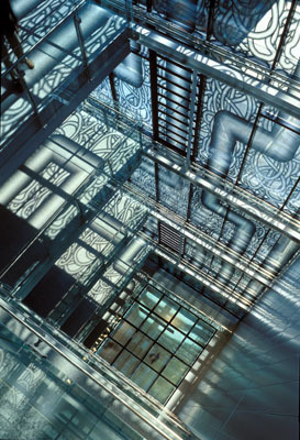 Auch der Konzeptkünstlers Daniel Buren spielt mit einer Glasfläche, indem er in die Passagenüberdachung einzelne bunte Glasfelder integriert und so den darunterliegenden Raum in angenehmes natürliches Licht taucht.