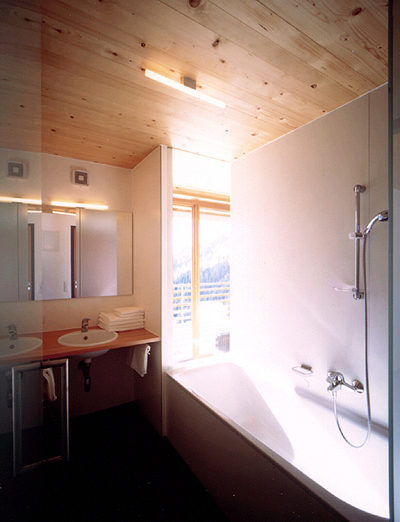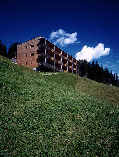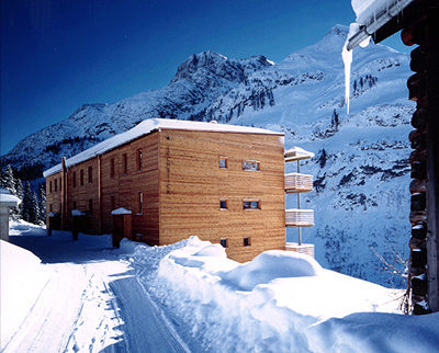 Exakt am Hang situiert, bietet das Apartmenthaus seinen Gästen eine Aussicht über das Tal bis nach Lech am Arlberg. 14 Apartments in zwei verschiedenen Größen stehen zur Auswahl. Die Grundrisse erstrecken sich über die gesamte Gebäudetiefe, jeder Einheit ist eine kleine Terrasse vorgelagert. Die Gäste sind autonom, da die gesamte Infrastruktur wie Rezeption im nahegelegenen Gasthof untergebracht ist. Das Haus ist in Massiv-Holzbauweise errichtet - eine Mischkonstruktion aus Holzständern und eingezogenen Betondecken. Außen wurden geölte Lärchenholzbretter für die Fassade verwendet, innen kommt Holz bei Decken und Böden zum Einsatz. Das Gebäude erfüllt die Kriterien eines Niedrigenergiehauses und wurde mit dem österreichischen Staatspreis für »Tourismus und Architektur« 2000 ausgezeichnet.