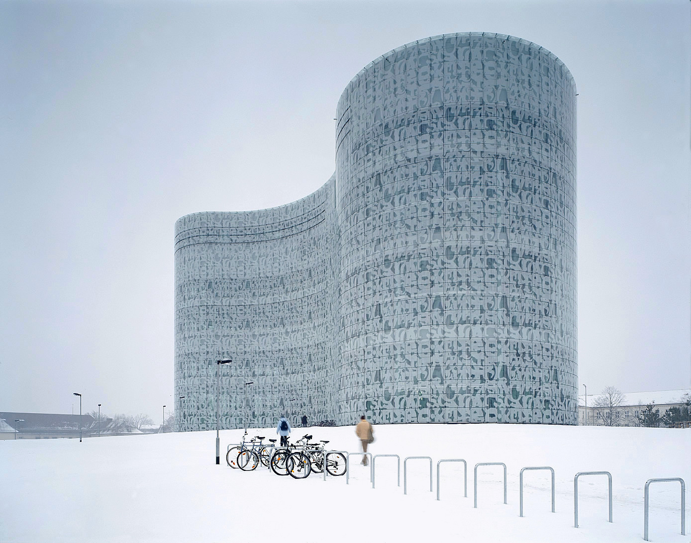 2005 wurde die neue Bibliothek der TU in Cottbus von Herzog & de Meuron eingeweiht (Seite 24). Der 32 Meter hohe festungsartige Bau entwickelte sich schnell zum Signet der Universität. Sein amöbenförmiger Baukörper mit Ausbuchtungen und Einschnürungen vermittelt als kapriziöser Solitär zwischen Stadt und Universitätscampus. Die doppelte Glasfassade ist mit überdruckten Buchstaben in verschiedenen Sprachen überzogen. Der Inhalt des Bauwerks wird gleichsam an der Fassade visualisiert. Diese »babylonische Sprachverwirrung« verwebt sich jedoch in der Ferne zu einem abstrakten Muster, das die Geschosseinteilungen überspielt und so dem Bau seinen monolithischen Charakter verleiht. Die Hülle für die Bücher wird hier gleichsam auch zu einem Medium. Diese Idee hatten die Schweizer Architekten bereits 1998 bei der Bibliothek der Fachhochschule in Eberswalde thematisiert. Dort bedruckten sie den kubischen Baukörper mit ausgewählten Fotografien von Thomas Ruff.