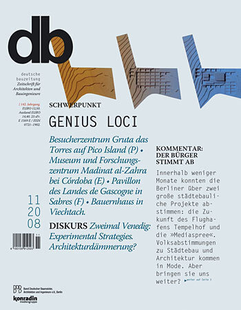 …   Versuch einer Annäherung an ein schwieriges Thema, das augenblicklich eine bedenkliche Konjunktur erlebt. Die Erfahrung ist sicher keinem unbekannt: Beim Besuch eines Ortes scheint dieser über seine bloße physische Präsenz hinaus eine besondere Atmosphäre zu besitzen; wahrnehm- aber nicht fass- oder benennbar. So belässt man es bei der lapidaren Aussage eines besonderen Geistes, der an diesem Ort »herrsche«; und erinnert sich seiner später meist in einer mit emotionalen Facetten gespeicherten Bildhaftigkeit. Genius loci? Die Antwort bietet sich an. Aber welcher Art sind die Orte, die eine solche Ausstrahlung besitzen? Kann Architektur einen Genius loci generieren? elp