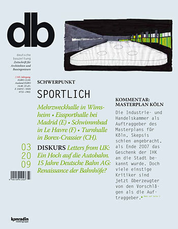 Die Eishalle tritt in einen spannenden Dialog über Zeit und wechselnde Moden mit dem Sportcenter von Fraile und Revillo: Statt auf sich selbst fokus-iert zu sein, öffnet sie sich ihrer Umgebung gezielt, ihre äußere Gestalt ist eher intuitiv als konsequent funktional entwickelt. Und ihre Materialwahl und Farbgebung, eine scheinbar willkürlich-spielerische Variation des Themas Pixelierung, wendet sich gegen das Diktat der Materialwahrhaftigkeit.