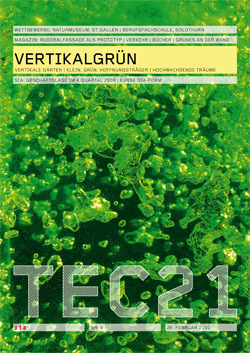 2010 ist das Jahr der Biodiversität – Grund genug, das uns umgebende Grün mit frischen Augen zu betrachten. Der Platz für die Natur wird immer knapper, zumal in unseren dichter werdenden Städten (vgl. auch «Natur in der Stadt», TEC21 11/2009). Dabei führt uns die Pflanzenwelt selbst vor Augen, wie die Abhilfe aussehen kann: Zahlreiche Pflanzengemeinschaften staffeln sich auch in der Höhe so, dass eine optimale Anzahl von ihnen auf der zur Verfügung stehenden Fläche ihr Auskommen findet. Und siehe da, seit einiger Zeit entdeckt auch die Architektur, dass «vertikal» und «grün» sehr gut zusammenpassen. Wirklich neu ist die Idee zwar nicht, werden doch bereits aus Babylon «Hängende Gärten» überliefert. Bei genauerer Betrachtung der antiken Beschreibungen zeigt sich jedoch, dass es sich damals wohl eher um eine frühe Form der Dachflächenbegrünung handelte: Die Terrassen bildeten ein Quadrat mit einer Seitenlänge von gut 100 m. Mit einem Unterbau aus gebrannten Ziegeln erreichten die Strukturen eine Höhe von etwa 30 m. Die Schriftsteller verraten sogar konstruktive Details über den dreilagigen Boden-aufbau: eine Schicht Rohr mit Asphalt, darüber eine doppelte Lage gebrannter Ziegel in Gipsmörtel und schliesslich dicke Platten aus Blei, um die Durchfeuchtung zu verhindern.