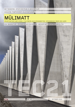 Das Sportausbildungszentrum Mülimatt evoziert prima vista das Bild einer gotischen Kathedrale. Wieder ist die innere Hülle, welche die beiden Hallen umfasst, ein Glasbehältnis. Doch das Betonfaltwerk – ein einheitliches, in sich stabiles Tragwerk – überspannt das Feld der beiden Hallen von 79.9 m × 55.4 m in einer ausladenden Geste als eine kontinuierliche Dachfläche, wie ein Tunnel. Als aussenliegendes Skelett überfängt es den Innenraum wie die Schale eines Krustentiers.
