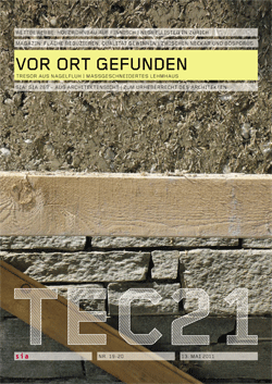 Die Raiffeisenbank ist die drittgrösste Bank der Schweiz. Zur Firmenphilosophie gehören neben der genossenschaftlichen Struktur insbesondere die Kundennähe und die lokale Verankerung, die auch durch die Pflege der Baukultur verwirklicht wird (vgl. Dossier Raiffeisenbank, Beilage zu TEC21 47/2006). 2006 fusionierten die Raiffeisenbanken am Rigi und Arth-Goldau zur Raiffeisenbank am Rigi mit Hauptsitz in Küssnacht. Um dem zusätzlichen Raumbedarf gerecht zu werden, lobte das Unternehmen im Frühling 2007 einen Studienauftrag mit Präqualifikation unter zehn eingeladenen Architekturbüros aus, den die Luzerner Architekten Lütolf und Scheuner für sich entschieden. Ihr Entwurf überzeugte mit der präzisen Reaktion auf die städtebauliche Ausgangslage und mit der intelligenten Umsetzung des Raumprogramms. Ausschlaggebend war aber der örtliche Bezug: Das Motiv für die Materialisierung der Fassade lieferte die Nagelfluh – ein junges Konglomerat aus Sedimentgestein mit gerundeten, farblich unterschiedlichen Gesteinskomponenten, das für die benachbarte Rigi typisch ist (Abb. 12).
