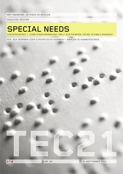 Die Gleichstellung von Menschen mit und ohne Behinderungen ist seit 1999 in der Bundesverfassung verankert, im Januar 2004 trat das Behindertengleichstellungsgesetz in Kraft.[2] Dieses «setzt Rahmenbedingungen, die es Menschen mit Behinderungen erleichtern, am gesellschaftlichen Leben teilzunehmen und selbstständig soziale Kontakte zu pflegen, sich aus- und fortzubilden und eine Erwerbstätigkeit auszuüben». Die Bedürfnisse, die Behinderte dabei haben, sind sehr unterschiedlich – je nach Handicap ist für sie der Umgang mit Alltagsgegenstän-den und Einrichtungen sowie die Überwindung von Barrieren, die für Gesunde kein gravierendes Hindernis darstellen, schwierig oder unmöglich. In Wohn- und Pflegeeinrichtungen wie dem Zürcher Mathilde-Escher-Heim («Welt aus Rampen») und dem WohnWerk Basel («Keine Schwellenangst») ist es selbstverständlich, dass die Architektur individuell auf diese Anforderungen reagiert. Im Alltag fehlen jedoch immer wieder logische Gebäudeerschliessungen für Rollstuhlfahrer, ausreichend gekennzeichnete Treppen für Sehbehinderte und eine durchdachte Umweltgestaltung im Sinne des «Design für Alle»-Konzepts[3] («Leben ohne Einschränkung»). Hindernisfreies Bauen hilft indes allen, ob jung oder alt, gesund oder krank: Der Einstieg ins Niederflurtram ist nicht nur für die Rollstuhlfahrerin einfacher, auch der Transport von Kinderwagen wird erleichtert. TEC21 wird sich im kommenden Jahr immer wieder der Hindernisfreiheit widmen und dabei in verschiedenen Heften die Bandbreite des Themas aufzeigen. In der vorliegenden Ausgabe finden sich auch Beiträge zum Wettbewerb für eine Behindertenwerkstatt und zu einer Auszeichnung für KMU, die Vorbilder für Integration sind. Auf der Bücherseite werden Planungshilfen vorgestellt, die Produkteseite widmet sich barrierefreier Lebensraumgestaltung.