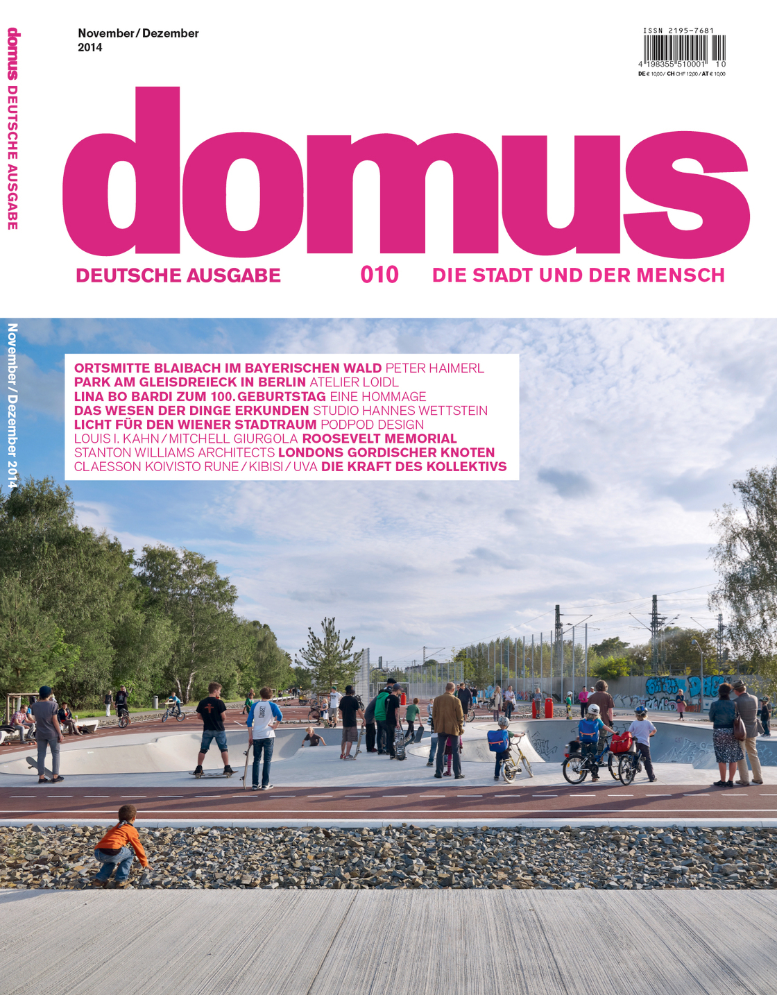 Wir stellen in der November/Dezember-Ausgabe der deutschen Domus verschiedene Orte vor, die für die Öffentlichkeit geplant sind. Unser Schwerpunkt konzentriert sich auf lokale Beispiele aus dem deutschsprachigen Kulturraum, die wir wie gehabt mit internationalen Projekten ergänzen. Dass auch verlassene Plätze, die ursprünglich einmal der Gemeinschaft dienten, neu entdeckt werden könnten, zeigt sich in Blaibach im Bayerischen Wald. Der Ortskern der kleinen Gemeinde stand bis vor Kurzem leer und wurde nun durch die städtebauliche und architektonische Intervention des Münchner Architekten Peter Haimerl revitalisiert. Das kleine Dorf in der Oberpfalz hat seine Mitte wiederentdeckt. Sein Bürgerhaus liegt nun zentral gleich unterhalb der Kirche und neben der neuen Konzerthalle. Das Engagement vieler Einzelner hat dieses Gemeinschaftsprojekt möglich gemacht, vom Gemeinderat und Architekten bis zum Förderverein des Konzerthauses, von den Organisatoren des Kulturwald-Musikfestivals bis zu den Sponsoren und den Helfern auf der Baustelle. Von Beginn an war der Planungsprozess in Blaibach öffentlich und zunächst nicht unumstritten bei den Dorfbewohnern. Sie haben viel diskutiert, kritisiert und verhandelt, bis der Konzertsaal schließlich im September eröffnet wurde. Die Öffentlichkeit in Planungsprozesse mit einzubeziehen, war für Lina Bo Bardi selbstverständlich. Am 5. Dezember 2014 wäre die italienisch-brasilianische Architektin, die kurzzeitig auch stellvertretende Chefredakteurin von Domus war, 100 Jahre alt geworden. Wir widmen ihr in der deutschen Domus zum Geburtstag einen Schwerpunkt, der ihr Werk aus verschiedenen Perspektiven zeigt.