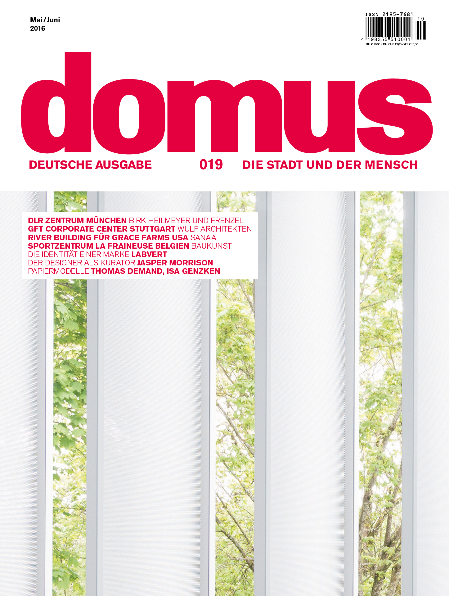 Auch diese Ausgabe der deutschen Domus hat noch einige Extras zu bieten - etwa die Ausstellungen der `Designbrüder´ Jasper Morrison und Naoto Fukasawa, die beide, ob Zufall oder nicht, am 5. Juni 2016 enden. Oder den Panoramaweg von Alejandro Aravena in Santiago de Chile sowie Richard J. Neutras hellsichtige Thesen zu einer umweltbewussten Architektur. Transparent, hell erleuchtet und flüchtig leicht runden wir das Spektrum ab: mit einer Glasarbeit von Richard Wright, Produktneuheiten der Light Building, Pavillons in Kopenhagen und Papierarbeiten von Thomas Demand.
