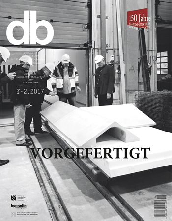 Da die Herstellung der Schalungen zu den wesentlichen Kostenfaktoren bei der Produktion von Betonfertigteilen zählt, entwickelte der Architekt eine Art Baukastensystem aus lediglich elf unterschiedlichen Elementen, mit denen sich – einschließlich gedrehter und gespiegelter Varianten – letztlich die gesamte hinterlüftete Fassade bespielen ließ. Während die Fertigteile entlang der Deckenstirnseiten durchgängig die gleiche Form haben (eine Ausnahme bilden lediglich die halbierten Elemente am Dachrand), gibt es bei den vertikalen Teilen eine größere Variationsbreite. Grundlage für die Einteilung der einzelnen »Rahmenfelder« ist sowohl die Lage der bestehenden Randpfeiler als auch der gleichmäßige Abstand der Bürotrennwände im Innern. Die unterschiedlichen Größen der Öffnungen hängen zudem noch von der jeweils dahinterliegenden Raumnutzung ab: Offene Bürobereiche verfügen bei gleichem Achsabstand über breitere Fensterflächen, d. h. die Betonelemente sind vergleichsweise schmal. Bei Einzelbüros hingegen ist der Fensteranteil etwas geringer, sodass am Ende ein lockerer Wechsel aus Winkeln, Flächen und Kanten entsteht, der dem Gebäude – trotz aller »Massivität« – eine elegante Leichtigkeit verleiht.