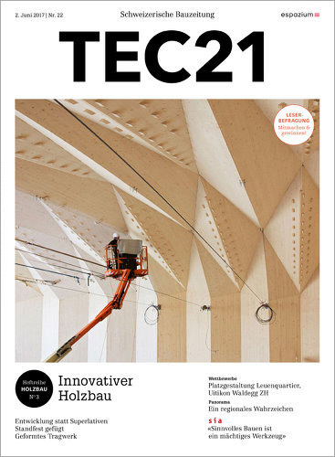 Entwicklungen im Holzbau sind dagegen oft bei weniger spektakulären, dafür umso durchdachteren Bauwerken zu finden. In der Schweiz gehören zwei Neubauten der ETH auf dem Campus Hönggerberg dazu: das House of Natural Resources (vgl. TEC21-Sonderheft «Stadt aus Holz», 2015) mit seiner Konstruktion aus Buche und Esche und das Arc_Tec_Lab (TEC21-Sonderheft «Arc_Tec_Lab», 2016) mit seiner Zero-Emissions-Architektur und einem Freiform-Holzdach von 2240 m² Fläche. Bereits seit 1991 steht bei der EPF Lausanne der «Polydôme», konzipiert von Julius Natterer. Diese als leichtes Flächentragwerk konstruierte Holzrippenschale überspannt einen Grundriss von 25 × 25 m. Die als Provisorium für das 700-Jahr-Jubiläum der Eidgenossenschaft erstellte Halle wird immer noch gern genutzt. Ebenfalls auf dem EPF-Gelände hat Kengo Kuma einen 250 m langen Pavillon geschaffen, der durch die Kombination aus Holz, Metall, Glas und einem Steinplattendach besticht.