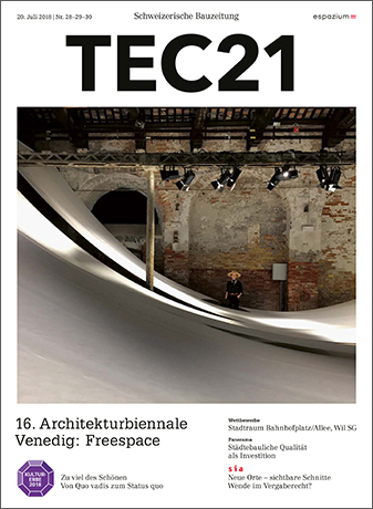 Die Kuratorinnen der 16. Architekturbiennale Venedig, Yvonne Farrell und Shelley McNamara vom irischen Büro Grafton, stellen die Hauptausstellung unter das Motto «Freespace». Was sie darunter verstehen, definieren sie in einem Manifest. Dessen Formulierung ist recht vage, um den eingeladenen Architektinnen und Architekten aus aller Welt möglichst viel Interpretationsfreiheit für ihre Beiträge zu lassen. Dennoch fällt auf, dass der Fokus eindeutig auf gestalterischen Fragen liegt: Es geht fast ausschliesslich um Themen wie räumliche Grosszügigkeit, Sinnlichkeit, Haptik und Materialisierung. «Die Grosszügigkeit des Geistes und der Sinn für Menschlichkeit im Herzen der architektonischen Agenda konzentrieren sich auf die Qualität des Raums», schreiben Farrell und McNamara gleich zu Beginn.
