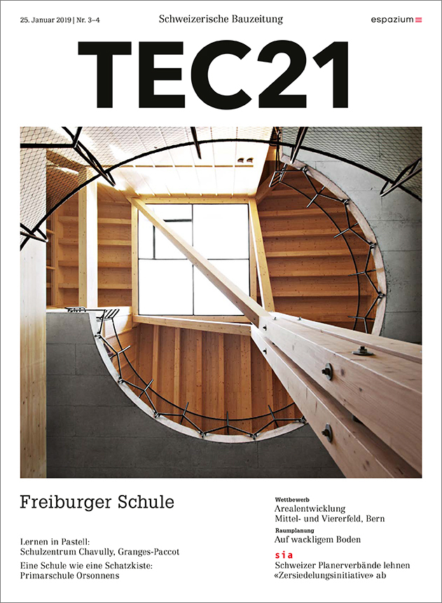 Das im September 2017 fertiggestellte Schulzentrum Chavully ist der zweite realisierte Bau des Büros. Schon der erste, die Primarschule Avry, lag im Kanton Freiburg (vgl. TEC21 26–27/2017), und auch die folgenden – alles Siegerprojekte aus Wettbewerben – sind Schulhäuser in der Romandie: das Collège de La Sarraz VD (Fertigstellung Sommer 2019), die Primarschule Praroman der Gemeinde Le Mouret FR (Wettbewerb Herbst 2018) und die Primarschule Champsec in Sion VS (Wettbewerb Herbst 2018). Die Zürcher scheinen mit ihren Ideen die lokalen Bedürfnisse und Erwartungen an ein Schulhaus besonders gut zu erfüllen.