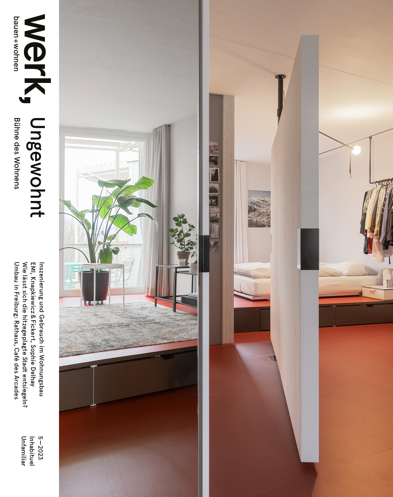 Zum Anfang der Konzeption von dieser Ausgabe liessen wir uns von einem Gefühl leiten: nämlich, dass die Beispiele alle in irgendeiner Form einem theatralischen Raumverständnis folgen – um damit direkt an das Heft «Tiefe» (wbw 3–2022) anzuschliessen. So verkörpert die Siedlung Vogelsang in Winterthur fast wörtlich ein bühnenhaftbarockes Architekturkonzept, indem die Entwerfenden das Wohnen als Komödie und die Architektur als Kulisse verstehen. In Ergänzung zu dieser Referenz an das Theater funktionieren die Bühnen von Edelaar Mosayebi Inderbitzin oder Sophie Delhay in einem modernistischen Sinn als «Maschinen», die das Wohnen performen. Im Wohnhaus von EMI in Zürich ist die Metapher direkt; bei Delhays zellu lären Grundrissen ihrer französischen Wohnanlagen funktioniert sie eher abstrakt und indem die Architektin einen regelbasiert-starren Bausatz von Räumen oder eben Bühnen vorgibt. Auf diesen Bühnen pulsiert das Leben. Kein Wunder, war für uns die grosse Entdeckung in diesem Heft eine gemeinsame literarische Referenz: Georges Perec. EMI und Delhay beziehen sich explizit auf dessen Spielanleitungen.