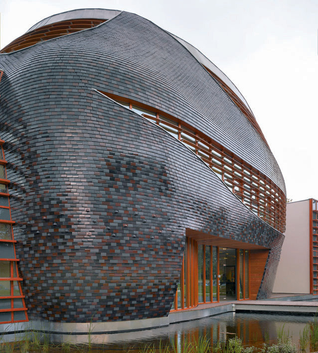 The „sustainability“ claim refers mainly to the materials, which include responsibly logged wood with FSC (Forest Stewardship Council) certification, bamboo from Columbia and tadelakt (Moroccan lime plaster). Leembouw Nederland, which produced the tadelakt, also supplied over 400 tons of clay for plastering ceilings and walls – a good example of how natural materials nowadays can be used in a very utilitarian and sophisticated way, something this company has specialized in. Investigations were also carried out to ensure that none of the materials used was produced with the help of child labour. One example of how natural processes come together in this „architectural biotope“ is the facade of the „blob“. The architect suggested titanium – one of the most sustainable materials –but the WWF rejected this as inconsistent with the required low-tech image. It was eventually decided to use variously tinted slates made from baked river clay. This product was supplied by brick and tile manufacturer Wienerberger, which has for many years sponsored the WWF’s campaign to rehabilitate Dutch river estuaries (in the interests of better water storage) by buying the clay excavated from the river beds.