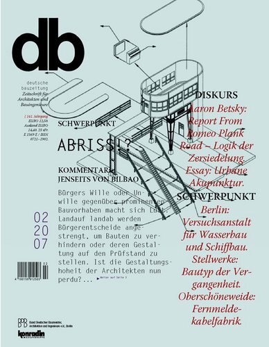 Frankfurt droht mit der weitgehenden Zerstörung der Großmarkthalle Martin Elsässers (1926–28) ein baukulturelles Desaster. Was dort der Bürgerzorn eventuell noch verhindern kann, ist in Berlin seit Ende 2006 Realität. Trotz vehementer Proteste wurde eines der bedeutendsten Industriedenkmale der Zwanzigerjahre abgerissen: die 1927–28 von Ernst Ziesel errichtete Fernmeldekabelfabrik in Oberschöneweide.