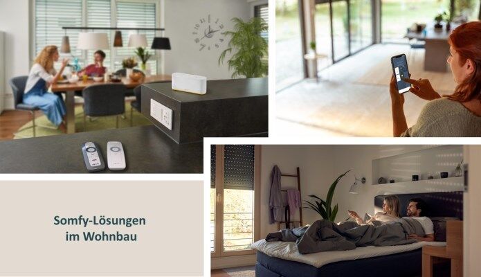 Funkgesteuerte Smart Home Systeme Sonnenschutz-Automatisierung: Somfy animeo Steuerung mit offenen Bussystemen KNX Verdrahtete Steuereinheiten für Sonnenschutzanlagen / Wohnbau
