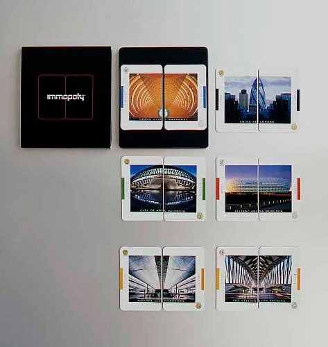 Das Kartenspiel immopoly präsentiert Bilder einzigartiger moderner Architektur der weltweit besten Architekten unserer Zeit. Die 20 Bauten sind in 5 Funktionen eingeteilt: Kultur - Hotel - Sport - Trade - Travel. Das immopoly Design ist der Architektur entsprechend - zeitlos elegant. Die Architekturfotografie zeigt Aufnahmen in Zentralperspektive oder als Frontalansicht. Die symmetrische Bildkomposition - typisch bei immopoly - kommt so konsequent zum Ausdruck.