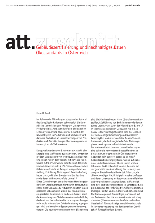 Österreich liegt seit Juli 2010 eine neue Version des Gebäudezertifizierungssystems TQB (Total Quality Building) vor. Somit sind gemeinsam mit dem Zertifizierungssystem DGNB (Deutsches Gütesiegel Nachhaltiges Bauen) zwei Systeme im Einsatz. Das neue Attachment gibt eine detaillierte Darstellung (mit exemplarischen Berechnungsbeispielen) über diese beiden österreichweit verbreiteten sowie über die beiden international wichtigsten Systeme BREEAM und LEED. Zusätzlich wird ein Überblick über das ganzheitliche System von Ökobilanzierungen, nationale und internationale Normungen zur Nachhaltigkeit sowie zu massgebenden Energiekennzahlen gegeben. Gespräche mit Experten, Glossar, Normenübersicht, Literaturverweise und Kontaktadressen runden den inhaltlichen Bogen ab.