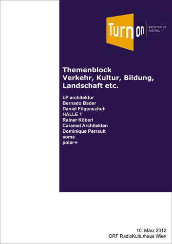 Die Plattform am Samstag präsentiert auch zum 10-jährigen Jubiläum ein weit gespanntes Vortragsprogramm führender ProtagonistInnen der österreichischen Architekturszene mit aktuellen Highlights, die im In-, aber auch im Ausland entstanden. Renommierte Architekten aus Paris und Berlin stellen den internationalen Rahmen her. Dominique Perrault ist anlässlich des Baus der Vienna DC Towers bei TURN ON zu Gast, und Arno Brandlhuber aus Berlin setzt einen Kontrapunkt zur österreichischen Entwicklung des Wohnbaus.