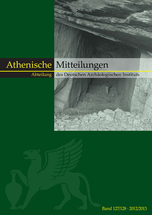 Eleftheria Kardamaki: A New Group of Figures and Rare Figurines from a Mycenaean Workshop Installation at Kontopigado, Alimos (Athens). – Kyriakos Psaroudakis: The Faience Finds of the Idaean Cave. – Hermann J. Kienast: Die Porossteinbrüche von Samos. – Jessica Paga: The Claw-Tooth Chisel and the Hekatompedon Problem. Issues of Tool and Technique in Archaic Athens. – Iulian Bîrzescu: Ein frühklassischer Torso aus der Tempelzone von Histria. – Volker Michael Strocka: Hadrian und Kekrops. – Anna. Lambropoulou, Anastasia G. Yangaki: A Reappraisal of the Published Ceramic Data from Ancient Olympia as a Source for the History of the Settlement during the Transitional Period of the Byzantine Era (7th – Early 9th Centuries AD).