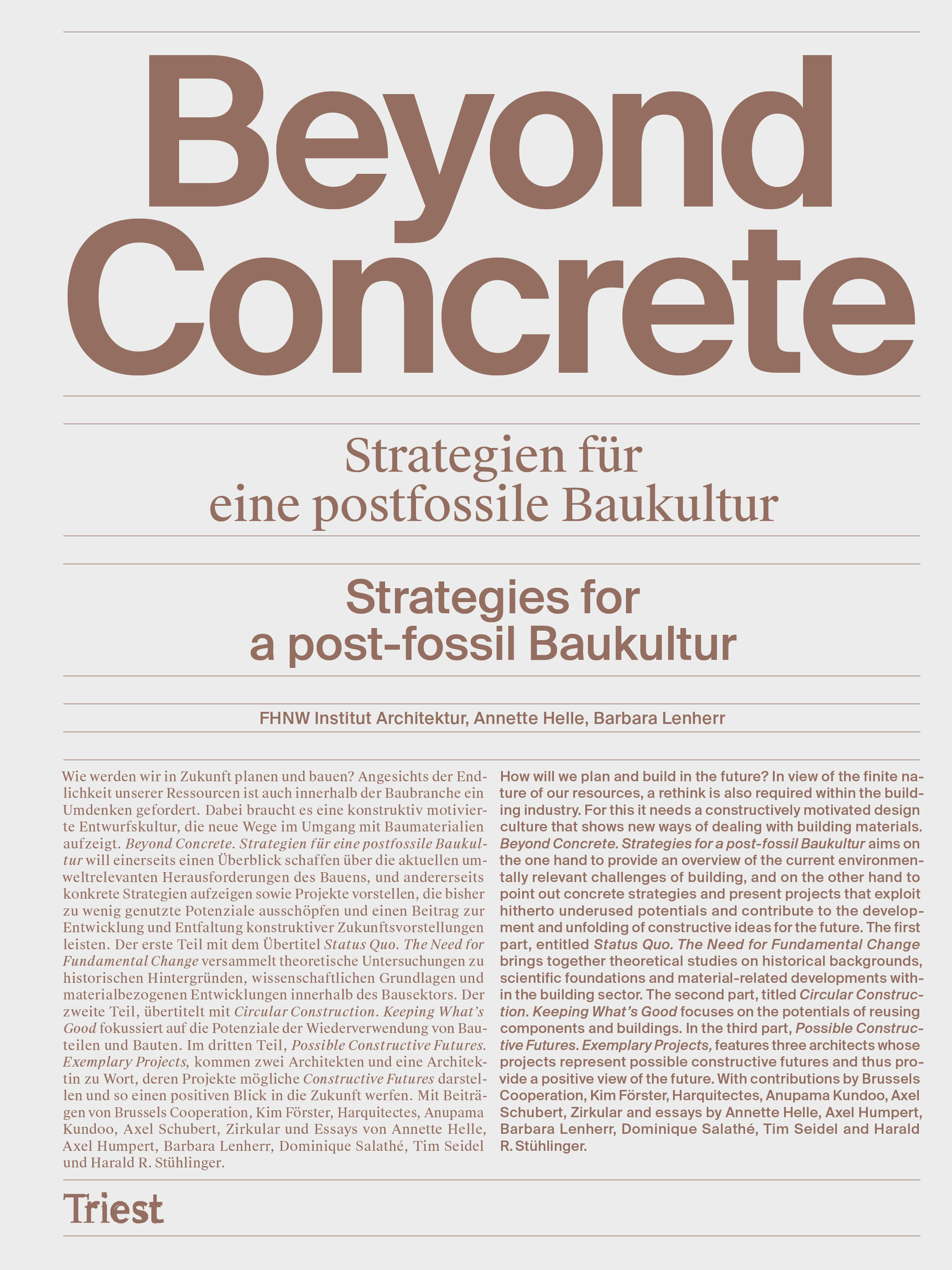 Beyond Concrete. Strategien für eine postfossile Baukultur versammelt Beiträge des Symposiums «Constructive Futures – Beyond Concrete», das den Auftakt für das Studienjahr 2021/2022 am Institut Architektur der FHNW bildete. Es ist ein besonderes Jahr, in dem alle Bachelor- und Masterprogramme gleichermassen dem unreflektierten Griff zu vermeintlich bewährten Bauweisen widerstehen müssen, um konstruktive und zukunftsträchtige Lösungen jenseits unserer fachlichen Komfortzonen zu erkunden. Das Symposium bot Anlass, darüber nachzudenken, wo die Bau- und Planungsbranche derzeit steht und warum uns ein grundlegender Wandel unabdingbar erscheint.