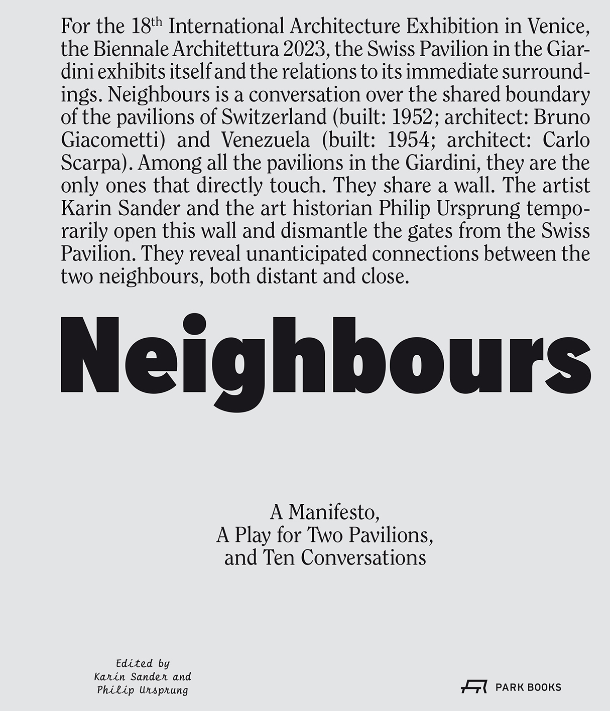 Der Schweizer Pavillon der 18. Internationalen Architekturausstellung der Biennale Venedig zeigt eine Ausstellung über dieses Gebäude selbst. Neighbours ist ein Gespräch über den Zaun hinweg zwischen den Pavillons der Schweiz (1952, Architekt: Bruno Giacometti) und demjenigen Venezuelas (1954, Architekt: Carlo Scarpa). Es sind dies die einzigen zwei Pavillons in den Giardini, die sich direkt berühren: Sie teilen sich eine Wand. Die Künstlerin Karin Sander und der Kunsthistoriker Philip Ursprung schneiden nun vorübergehend eine Öffnung in diese Wand und demontieren die Tore des Schweizer Pavillons. Durch die Beseitigung der Barrieren werden unvorhergesehene Verbindungen zwischen den beiden Nachbarn sichtbar, sowohl in der Ferne als auch in der Nähe.