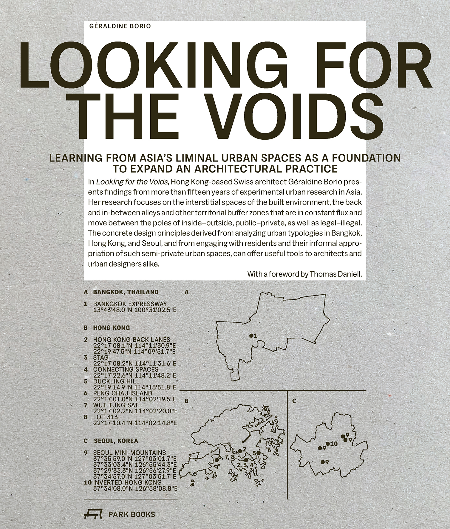 In Looking for the Voids präsentiert die in Hong Kong arbeitende Schweizer Architektin Géraldine Borio Erkenntnisse ihrer fünfzehnjährigen experimentellen Forschungsarbeit in Asien. Ihr Fokus liegt dabei auf den Zwischenräumen der gebauten Umwelt, den Seitengassen und Bürgersteigen, die sich in ständiger Veränderung befinden und sich zwischen den Polen innen – aussen, öffentlich – privat, legal – illegal bewegen.
