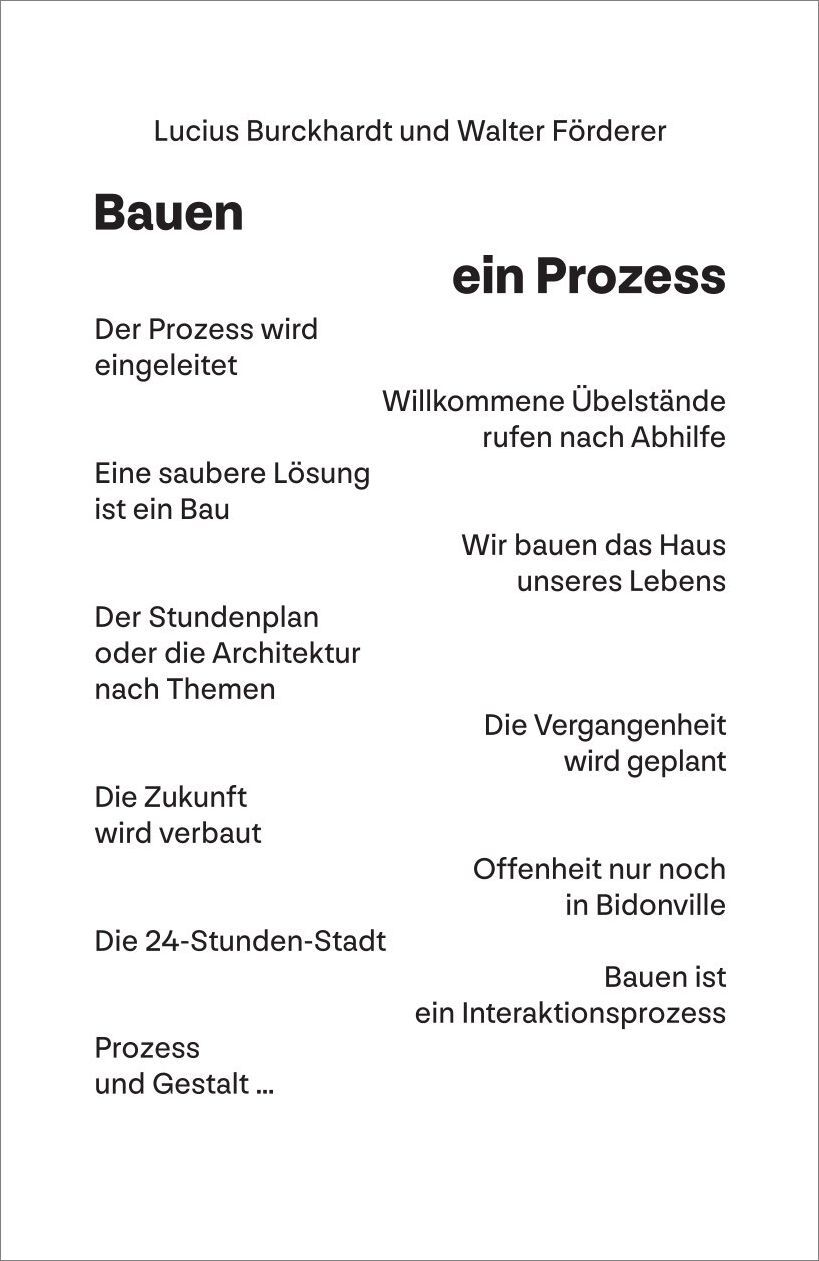 Man könnte Lucius Burckhardt, den Soziologen, und Walter Maria Förderer, den Architekten, für ein ungleiches Paar halten. Doch ihre gemeinsame Publikation Bauen ein Prozess vereint scharfsinnige Analyse und künstlerische Vision zu einem Manifest des Umbaus, das aktueller denn je ist. 1968 erschienen, legt die Schrift den Fokus auf die Phasen vor der Grundsteinlegung und nach der Eröffnung – ein radikaler Perspektivwechsel, der politische Prozesse, bauliche Flexibilität und Nutzende mit einbezieht.